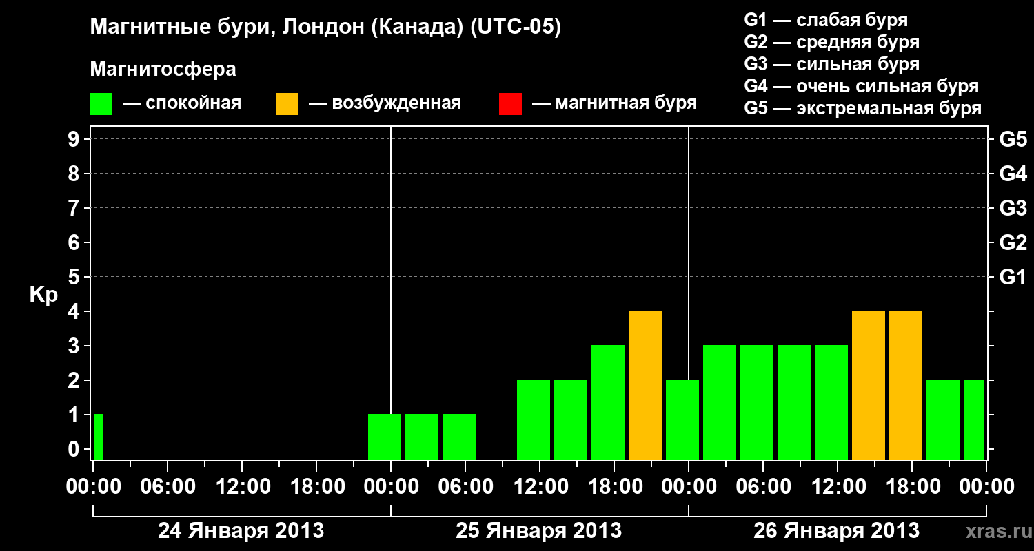 Изменения геомагнитного индекса Kp с 24 по 26 января 2013 года для средних широт