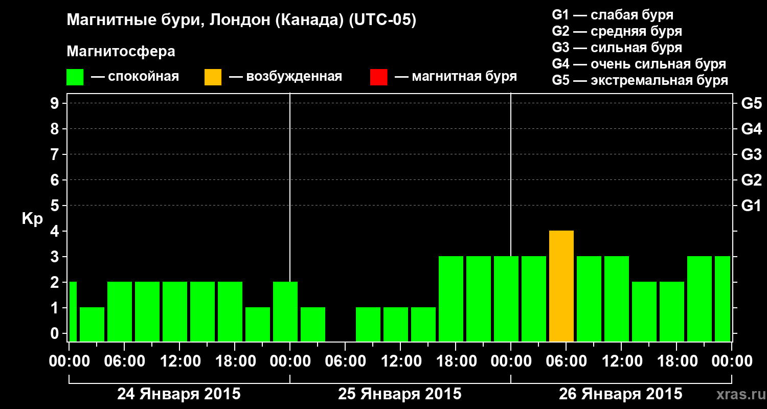 Изменения геомагнитного индекса Kp с 24 по 26 января 2015 года для средних широт