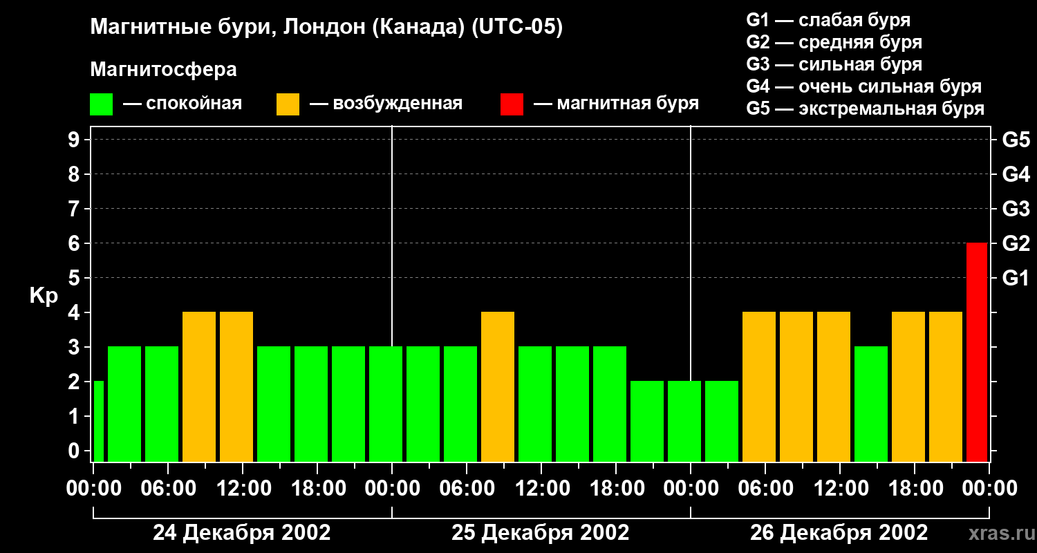 Изменения геомагнитного индекса Kp с 24 по 26 декабря 2002 года для средних широт