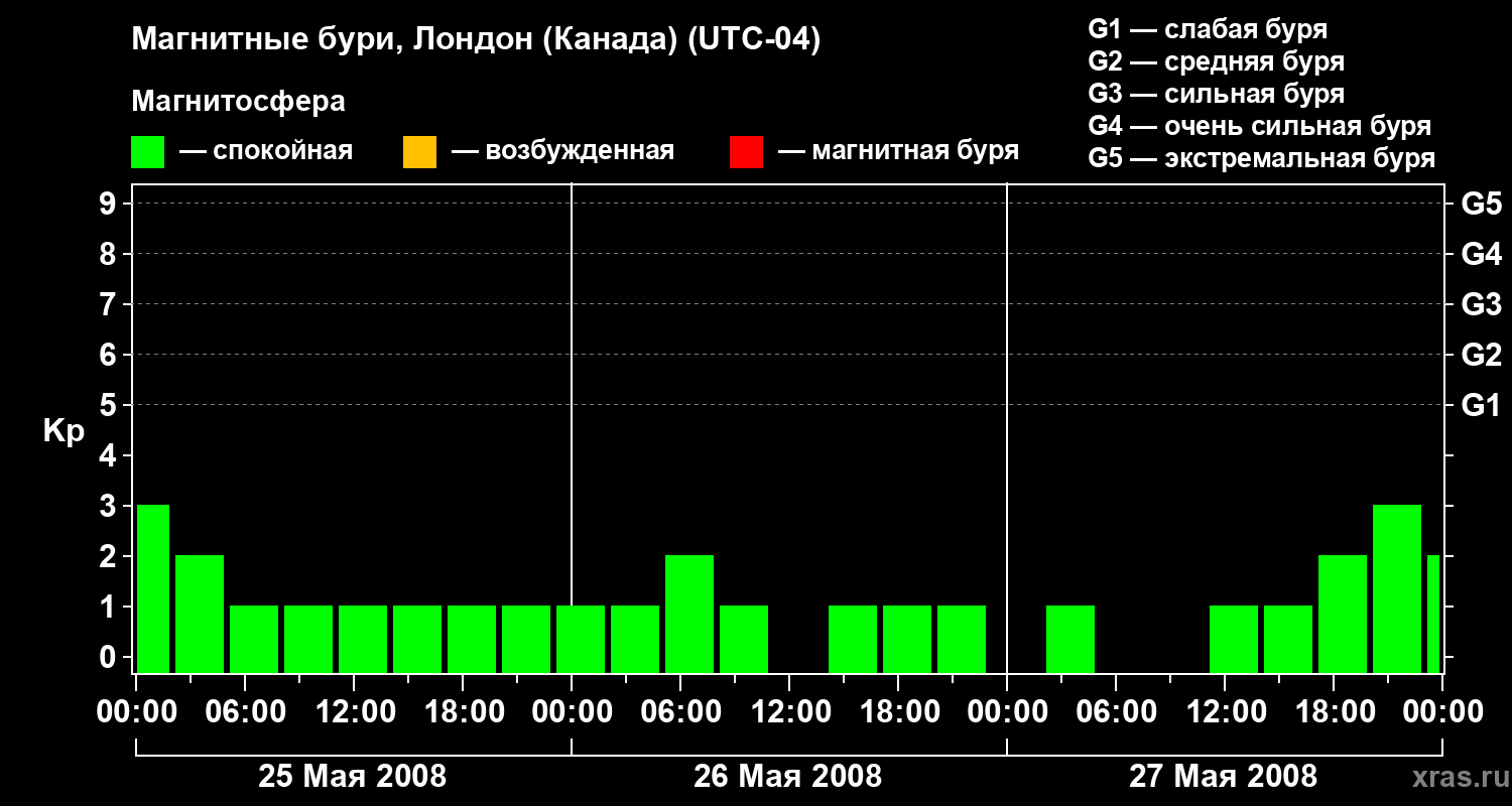 Изменения геомагнитного индекса Kp с 25 по 27 мая 2008 года для средних широт