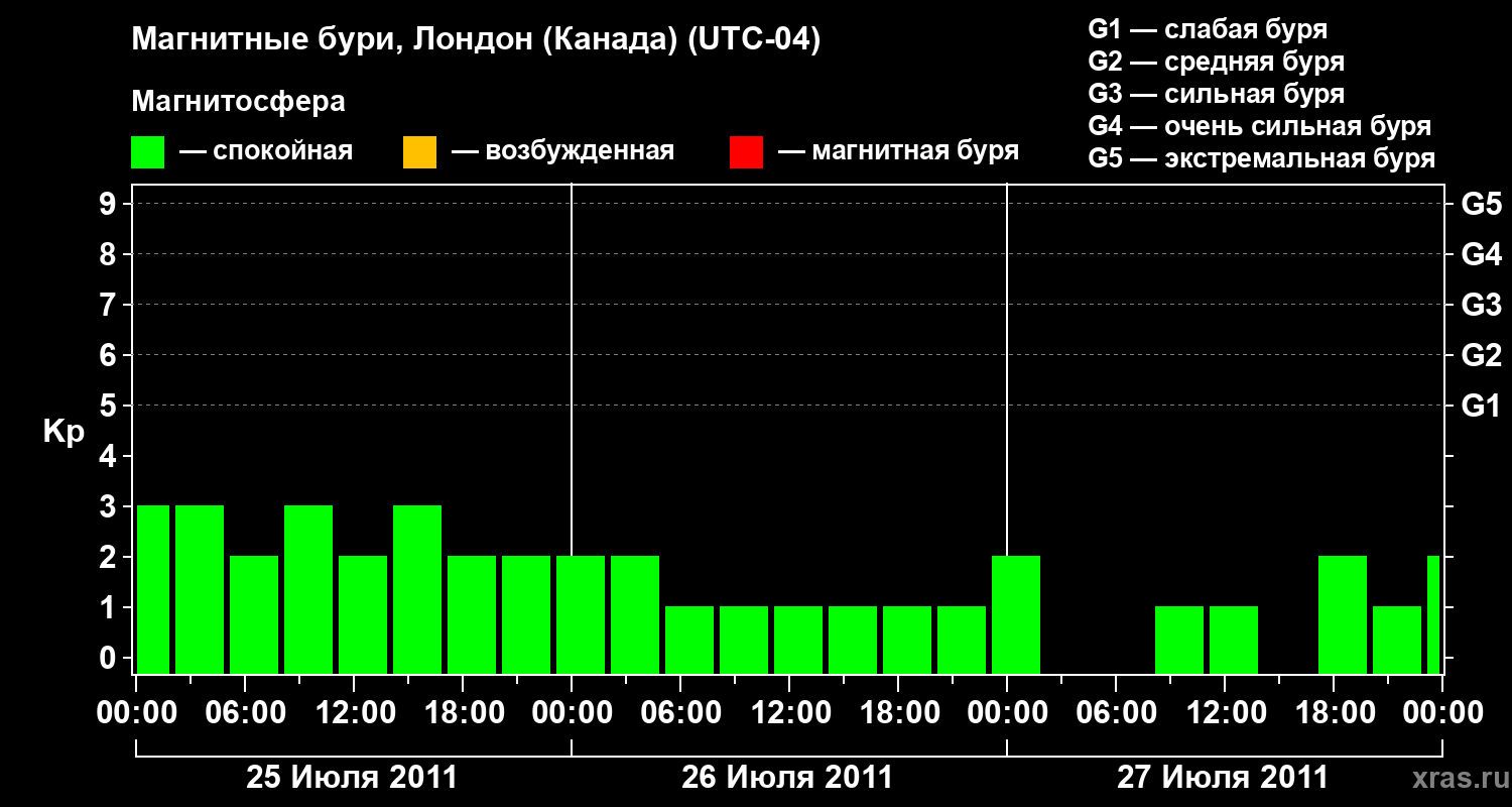 Изменения геомагнитного индекса Kp с 25 по 27 июля 2011 года для средних широт