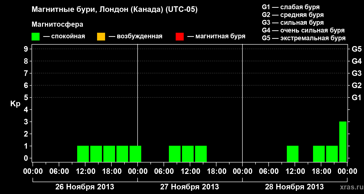 Изменения геомагнитного индекса Kp с 26 по 28 ноября 2013 года для средних широт