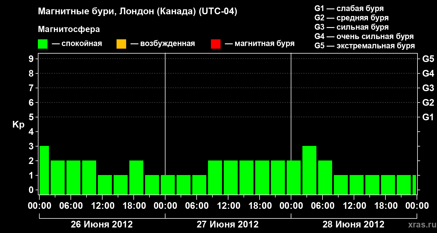 Изменения геомагнитного индекса Kp с 26 по 28 июня 2012 года для средних широт