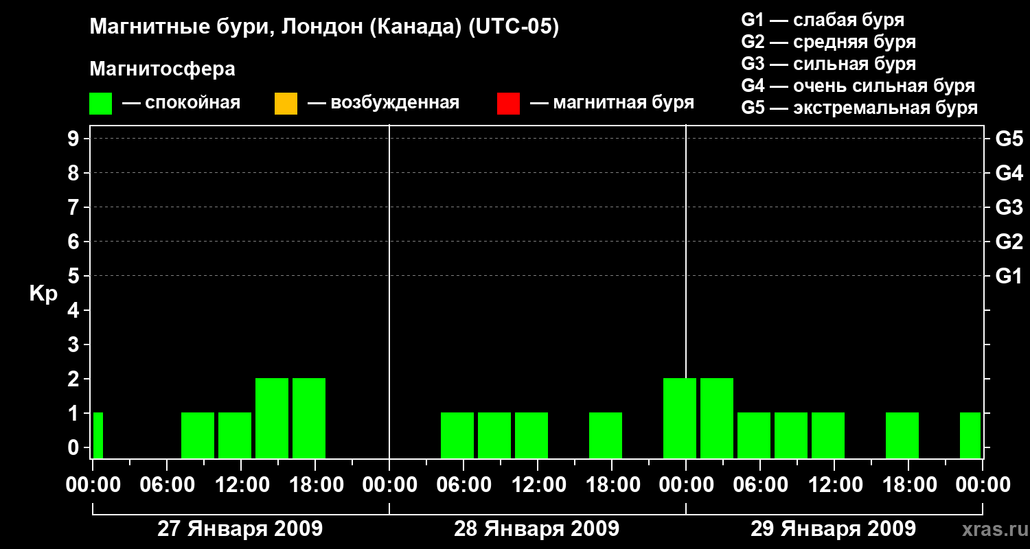 Изменения геомагнитного индекса Kp с 27 по 29 января 2009 года для средних широт