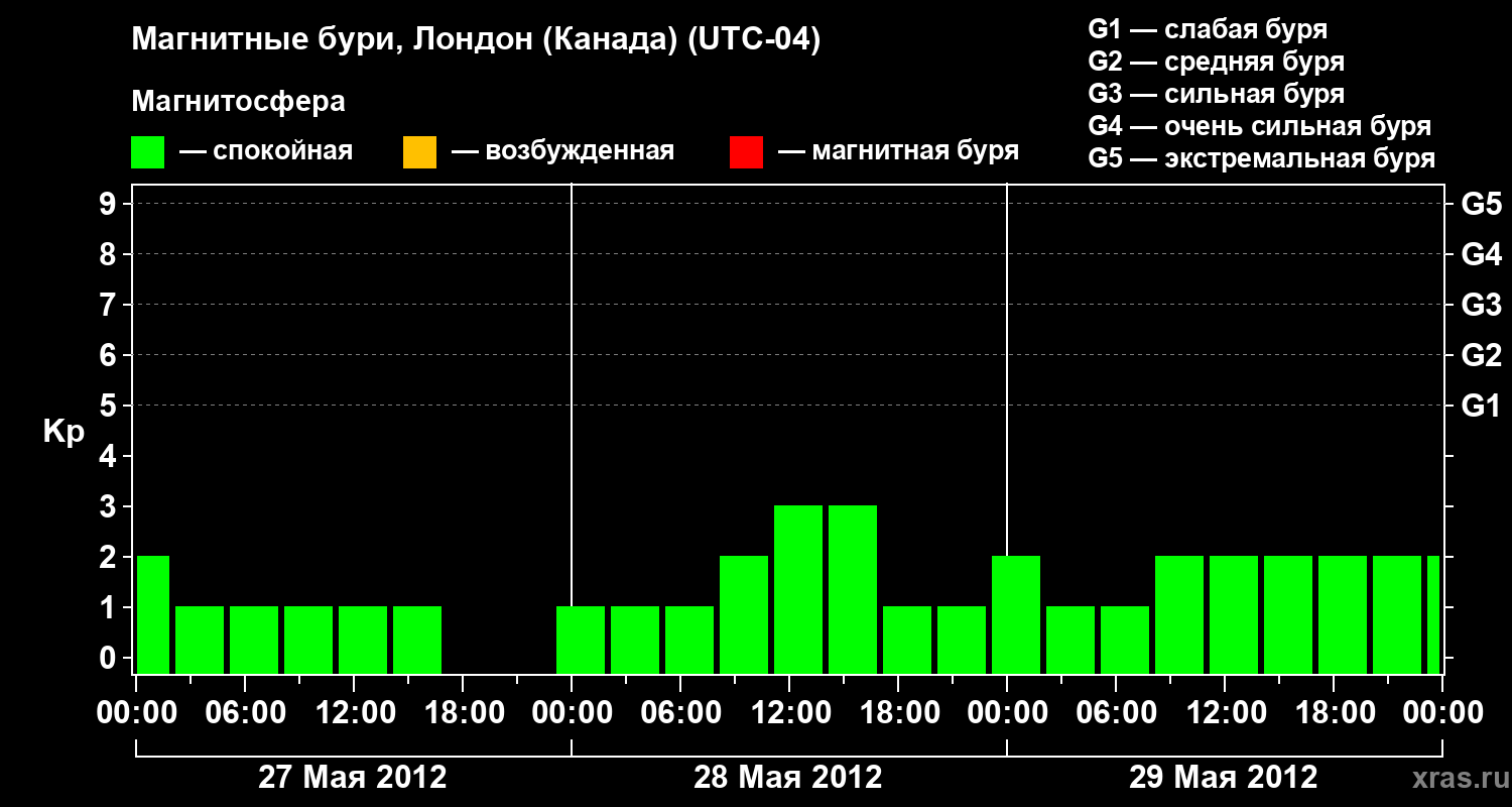 Изменения геомагнитного индекса Kp с 27 по 29 мая 2012 года для средних широт