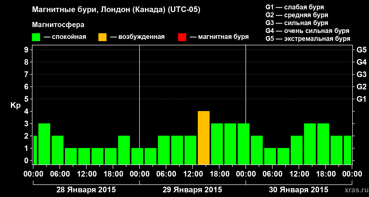 Изменения геомагнитного индекса Kp с 28 по 30 января 2015 года для средних широт