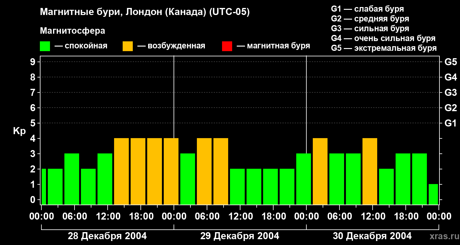 Изменения геомагнитного индекса Kp с 28 по 30 декабря 2004 года для средних широт