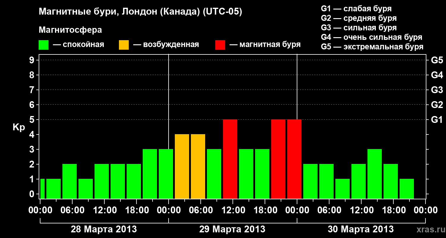 Изменения геомагнитного индекса Kp с 28 по 30 марта 2013 года для средних широт