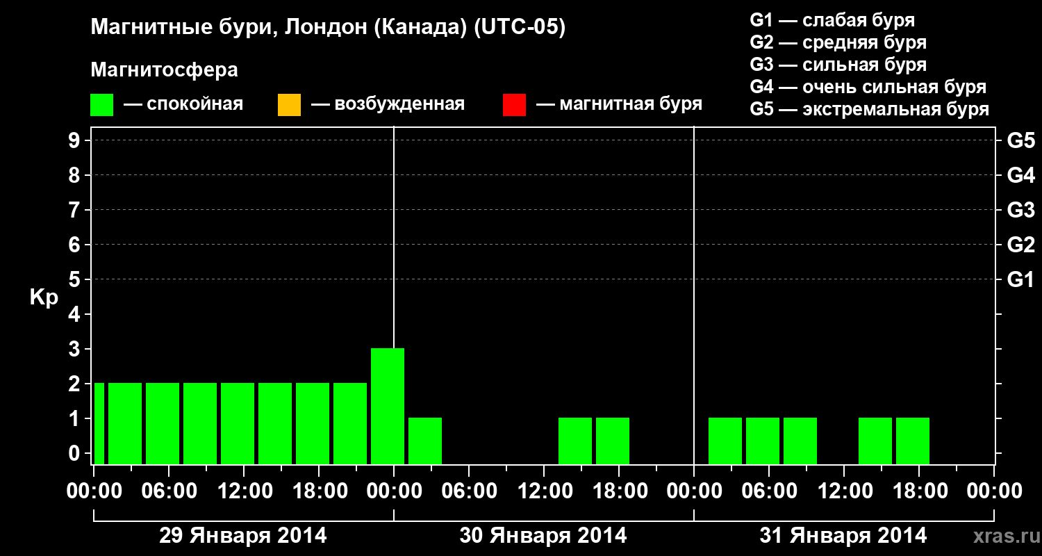 Изменения геомагнитного индекса Kp с 29 по 31 января 2014 года для средних широт