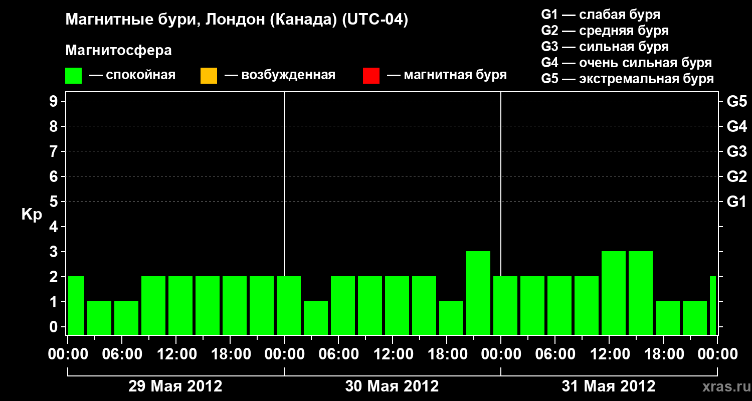 Изменения геомагнитного индекса Kp с 29 по 31 мая 2012 года для средних широт