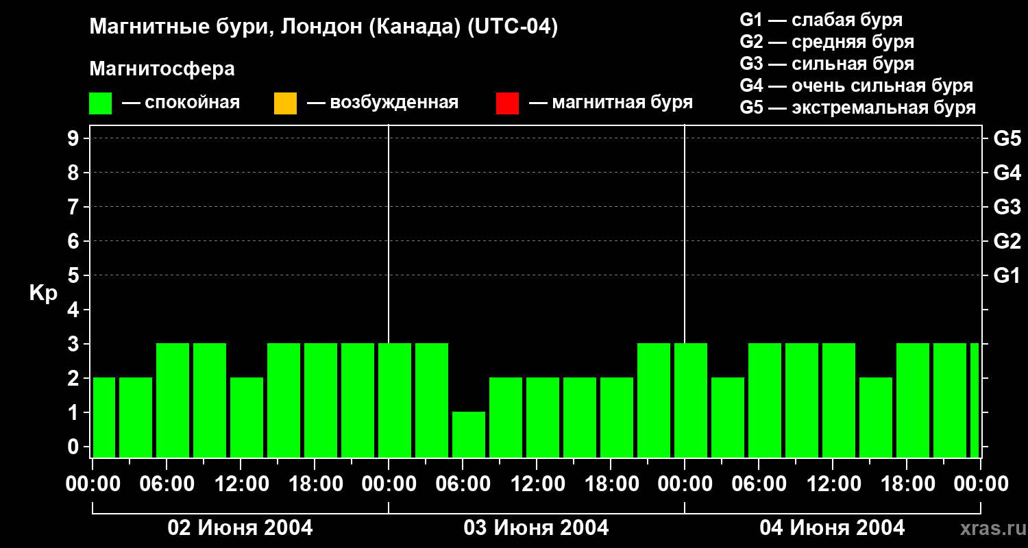 Изменения геомагнитного индекса Kp с 2 по 4 июня 2004 года для средних широт