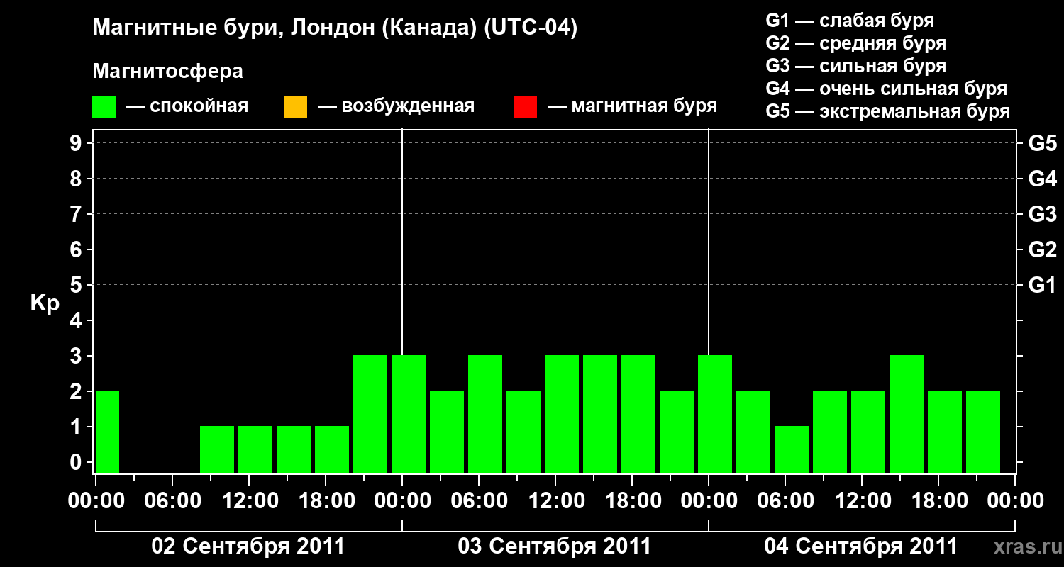 Изменения геомагнитного индекса Kp с 2 по 4 сентября 2011 года для средних широт