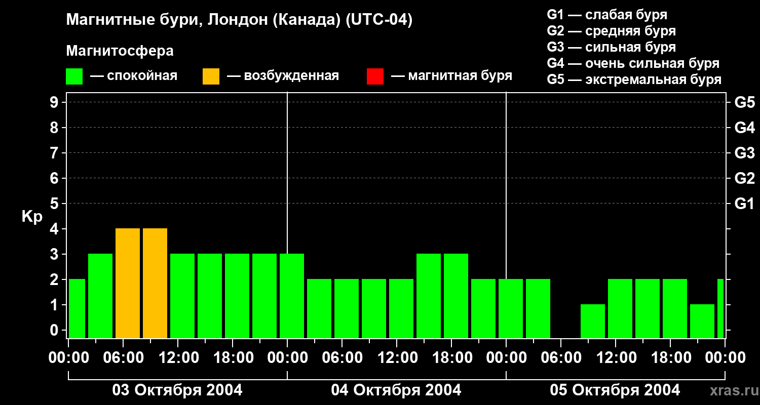 Изменения геомагнитного индекса Kp с 3 по 5 октября 2004 года для средних широт