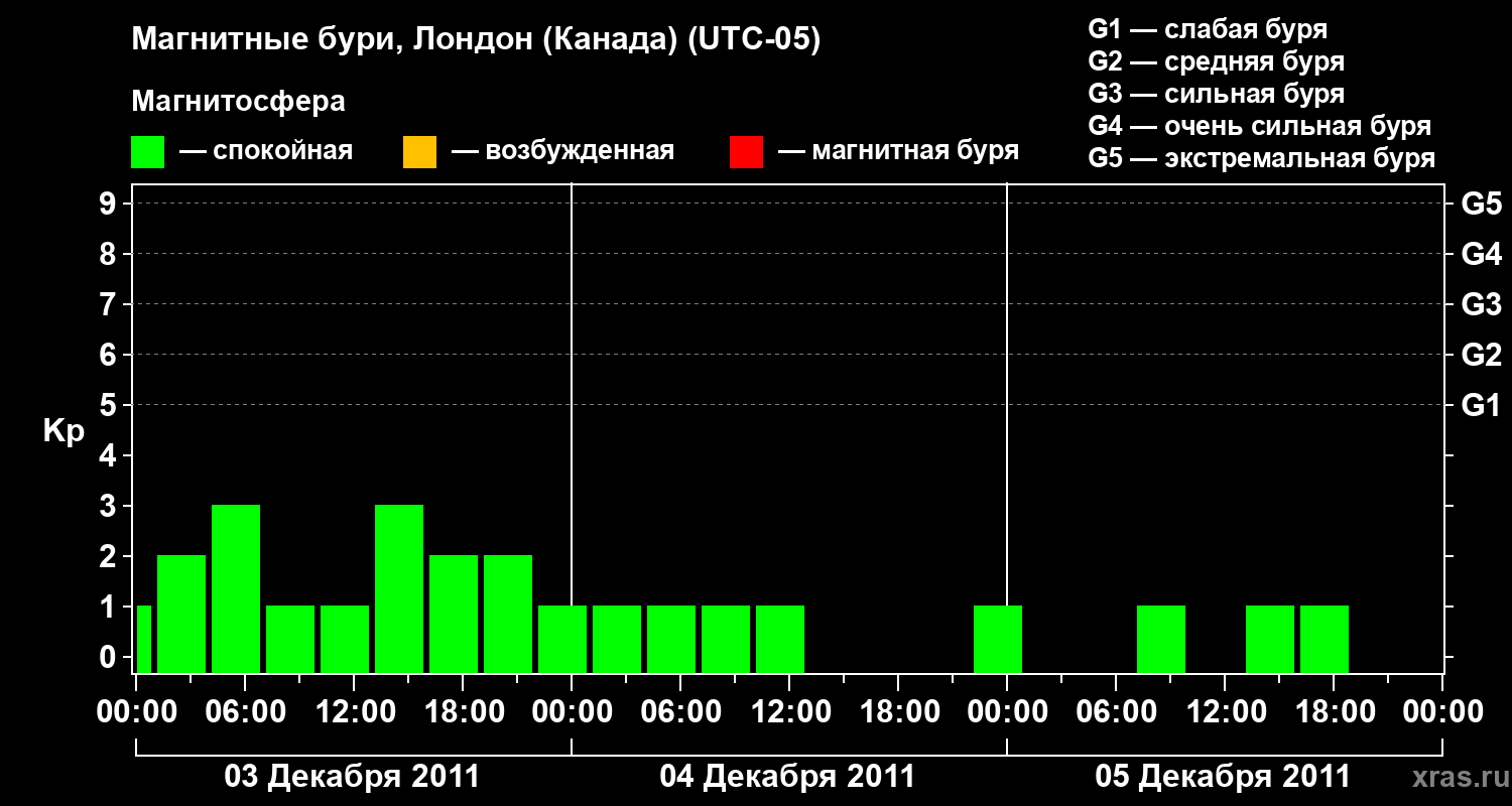 Изменения геомагнитного индекса Kp с 3 по 5 декабря 2011 года для средних широт