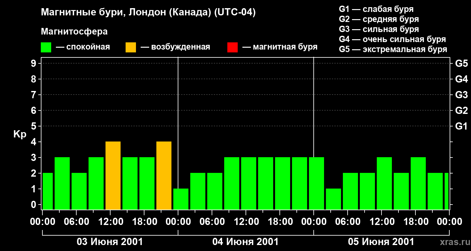 Изменения геомагнитного индекса Kp с 3 по 5 июня 2001 года для средних широт