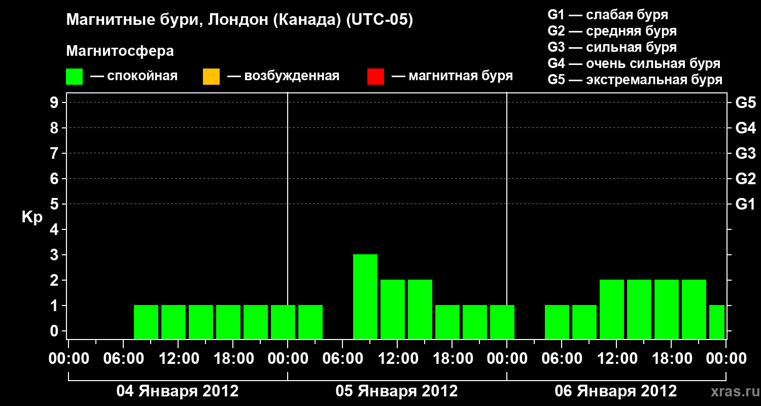 Изменения геомагнитного индекса Kp с 4 по 6 января 2012 года для средних широт