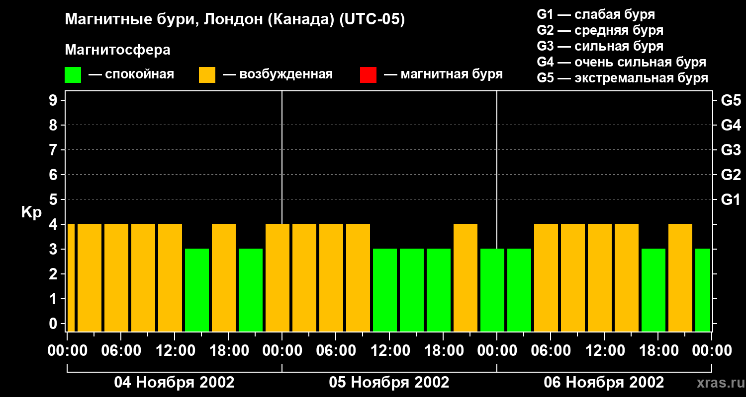 Изменения геомагнитного индекса Kp с 4 по 6 ноября 2002 года для средних широт