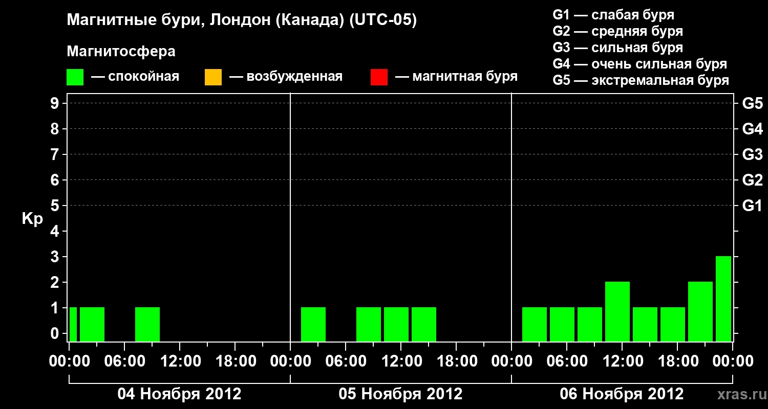 Изменения геомагнитного индекса Kp с 4 по 6 ноября 2012 года для средних широт