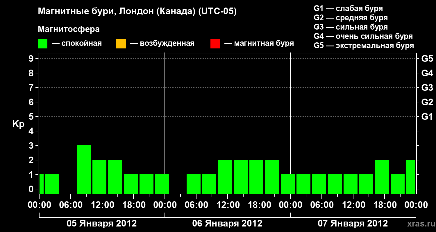 Изменения геомагнитного индекса Kp с 5 по 7 января 2012 года для средних широт
