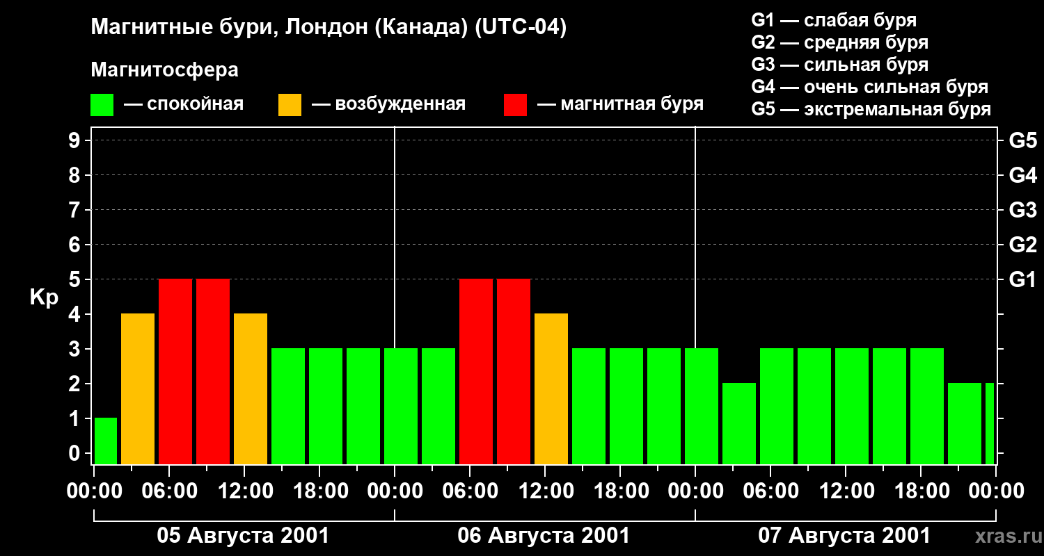 Изменения геомагнитного индекса Kp с 5 по 7 августа 2001 года для средних широт