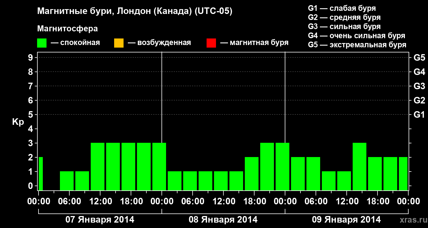 Изменения геомагнитного индекса Kp с 7 по 9 января 2014 года для средних широт