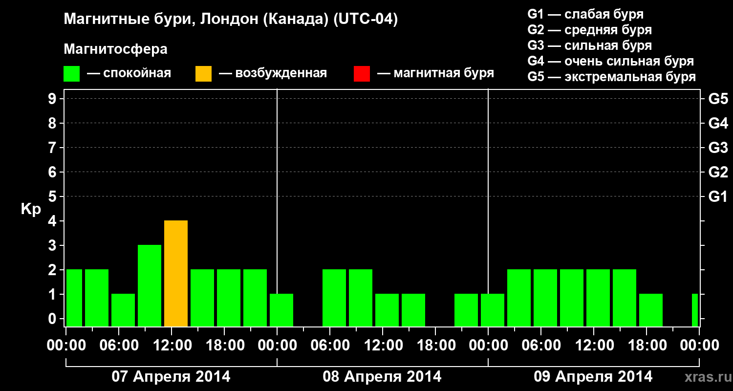 Изменения геомагнитного индекса Kp с 7 по 9 апреля 2014 года для средних широт