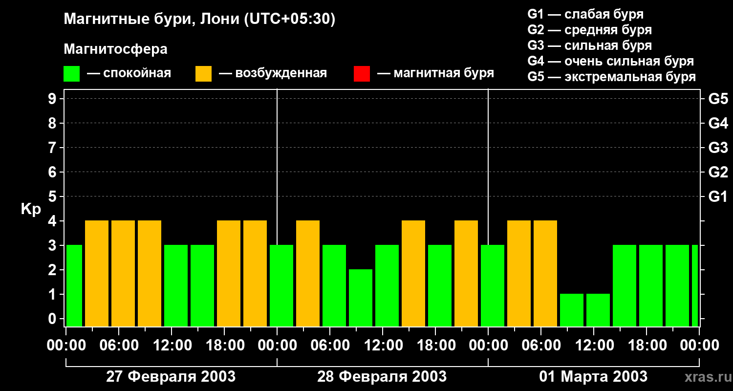 Изменения геомагнитного индекса Kp с 27 февраля по 1 марта 2003 года для средних широт