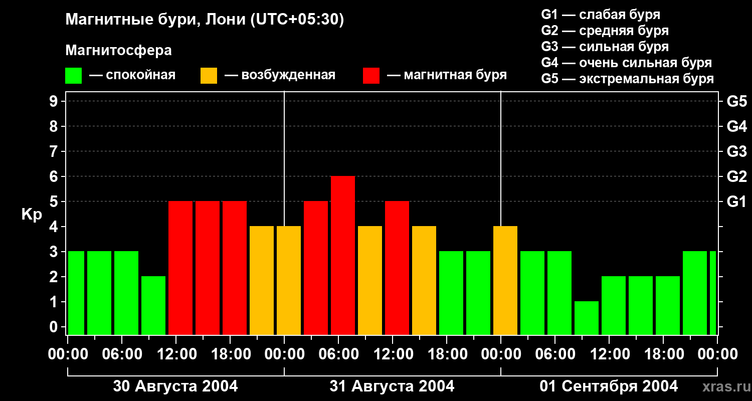 Изменения геомагнитного индекса Kp с 30 августа по 1 сентября 2004 года для средних широт