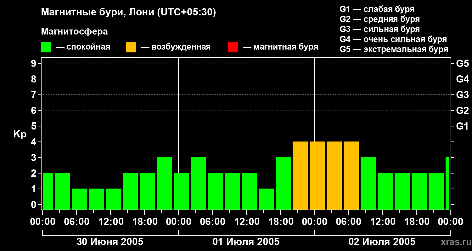 Изменения геомагнитного индекса Kp с 30 июня по 2 июля 2005 года для средних широт