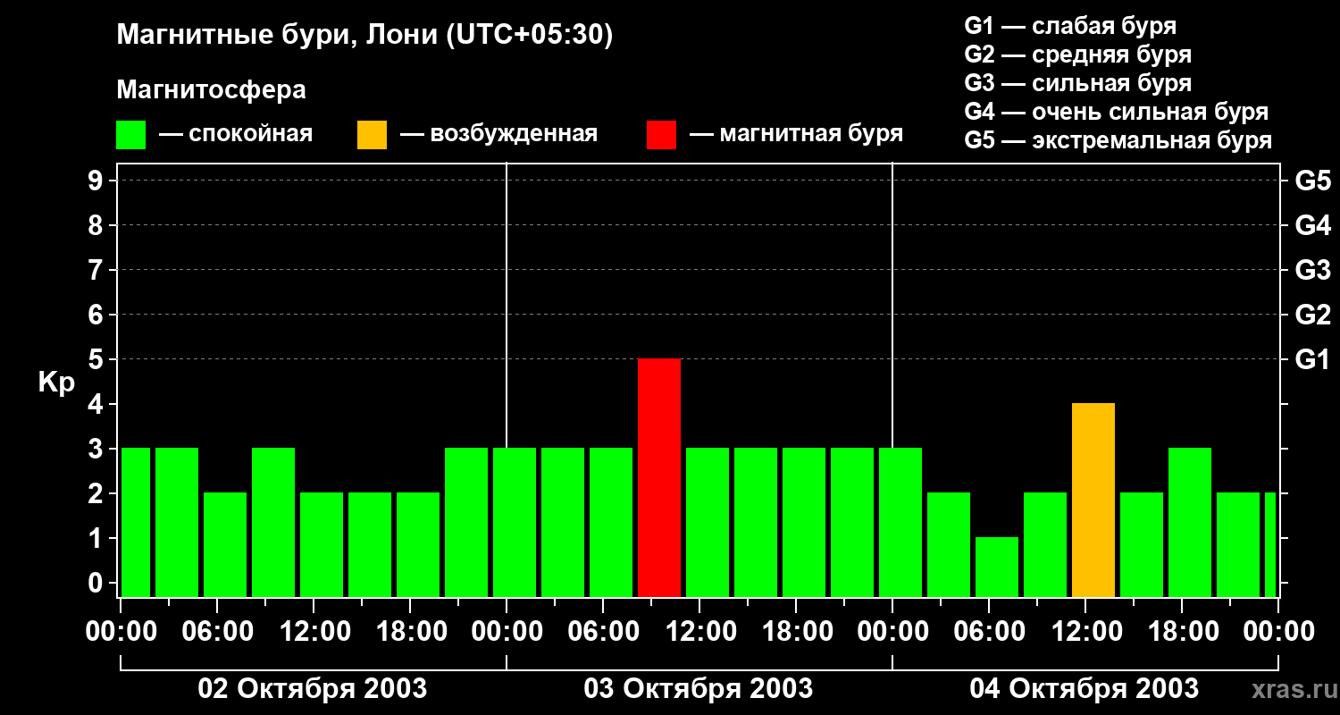 Изменения геомагнитного индекса Kp с 2 по 4 октября 2003 года для средних широт