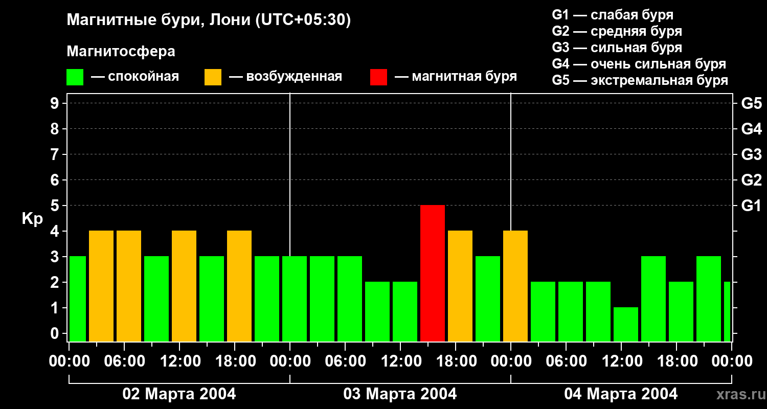 Изменения геомагнитного индекса Kp с 2 по 4 марта 2004 года для средних широт