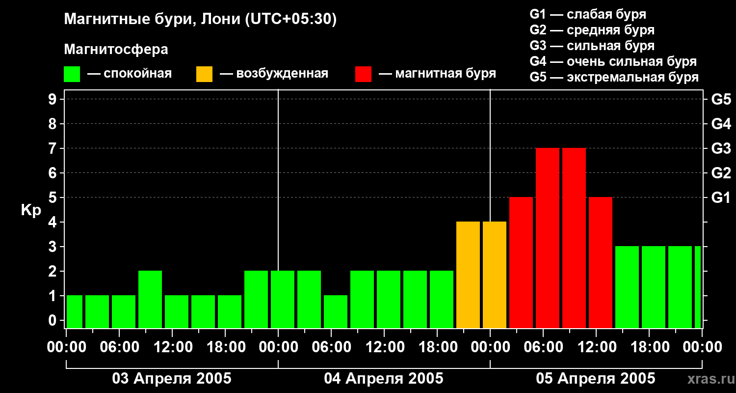 Изменения геомагнитного индекса Kp с 3 по 5 апреля 2005 года для средних широт