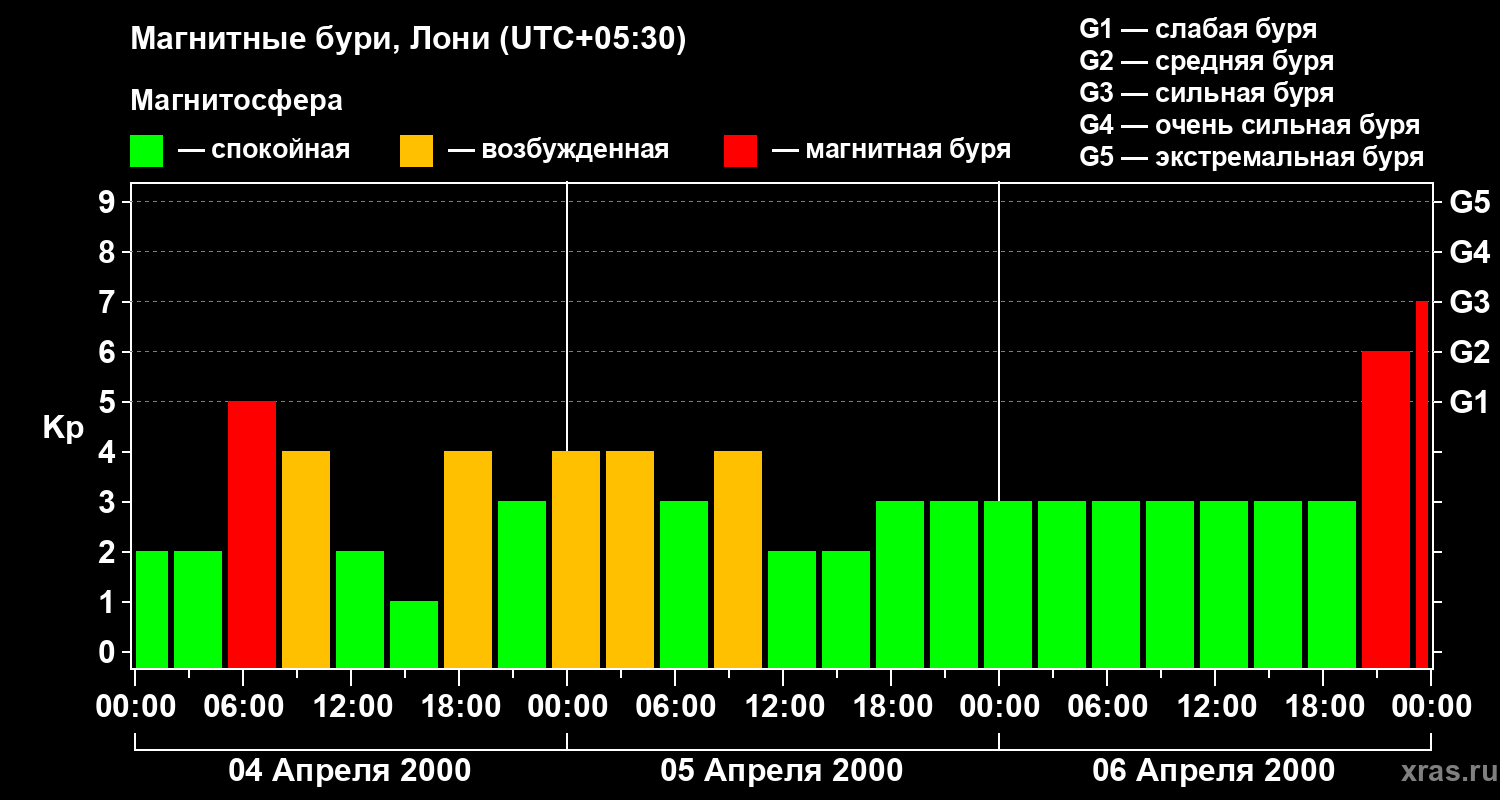 Изменения геомагнитного индекса Kp с 4 по 6 апреля 2000 года для средних широт
