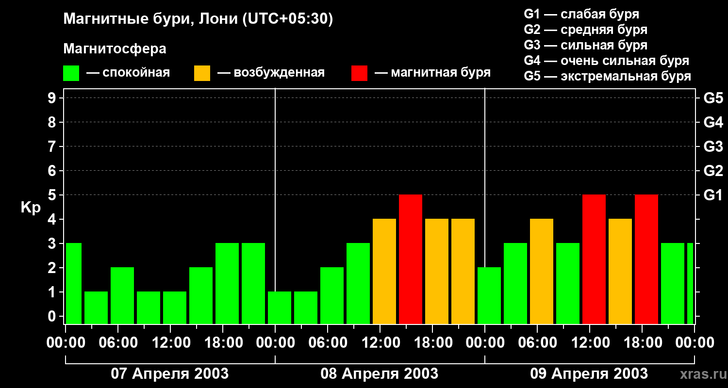 Изменения геомагнитного индекса Kp с 7 по 9 апреля 2003 года для средних широт
