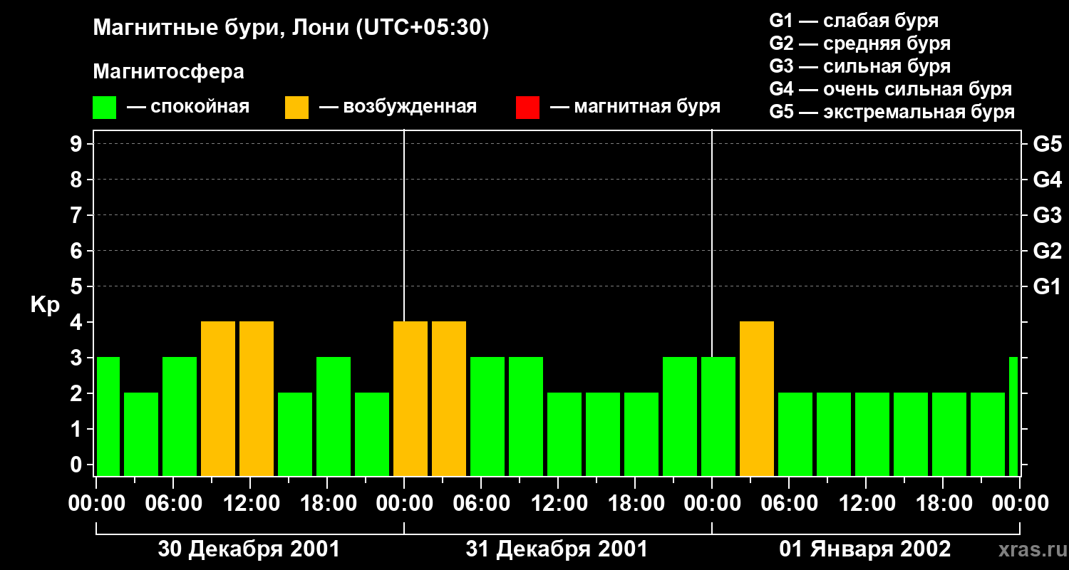 Изменения геомагнитного индекса Kp с 30 декабря 2001 года по 1 января 2002 года для средних широт