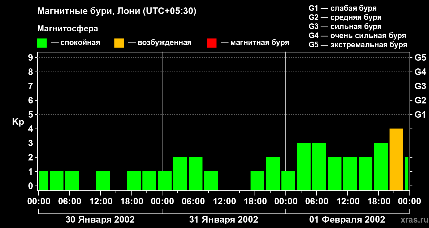 Изменения геомагнитного индекса Kp с 30 января по 1 февраля 2002 года для средних широт