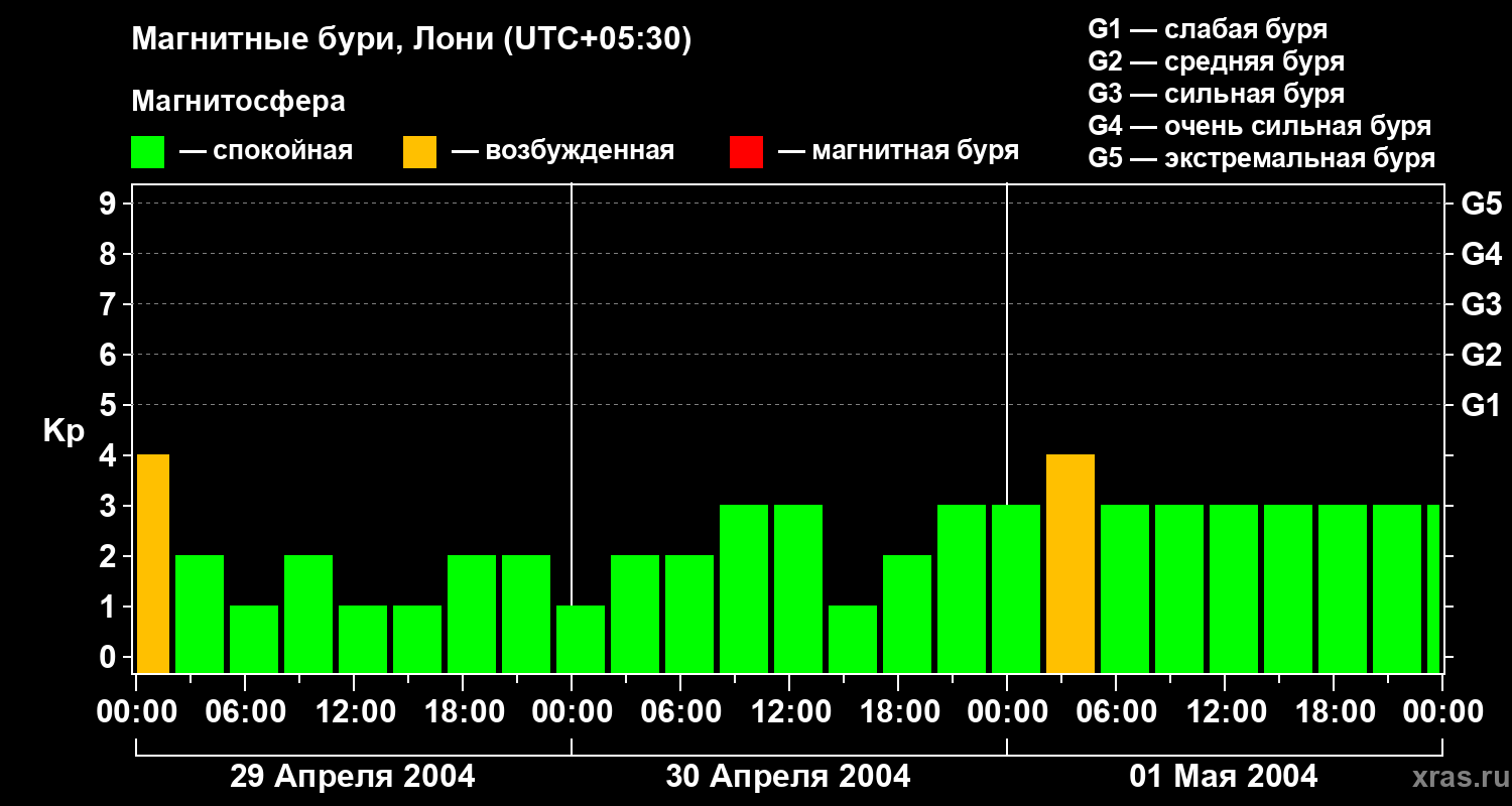 Изменения геомагнитного индекса Kp с 29 апреля по 1 мая 2004 года для средних широт