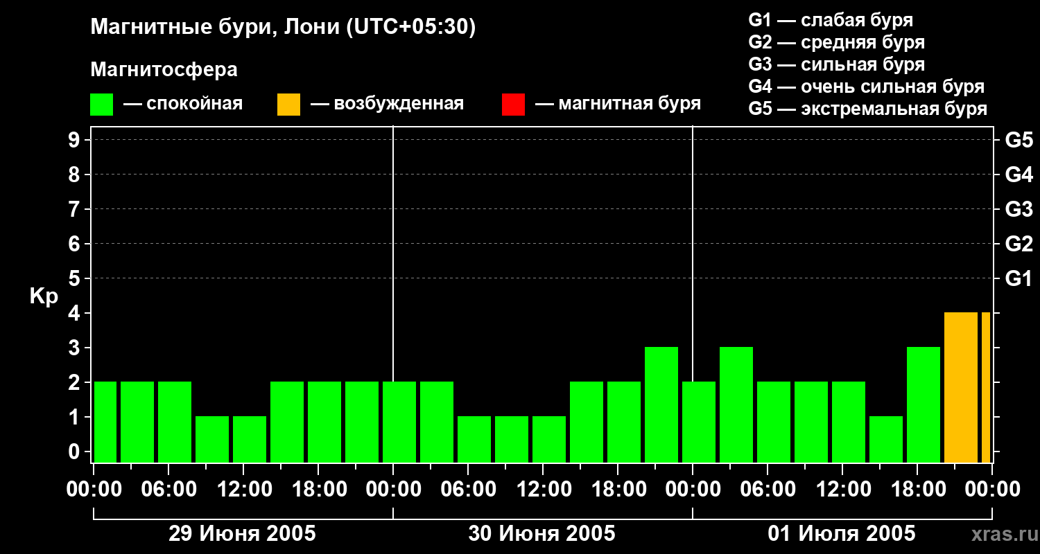 Изменения геомагнитного индекса Kp с 29 июня по 1 июля 2005 года для средних широт