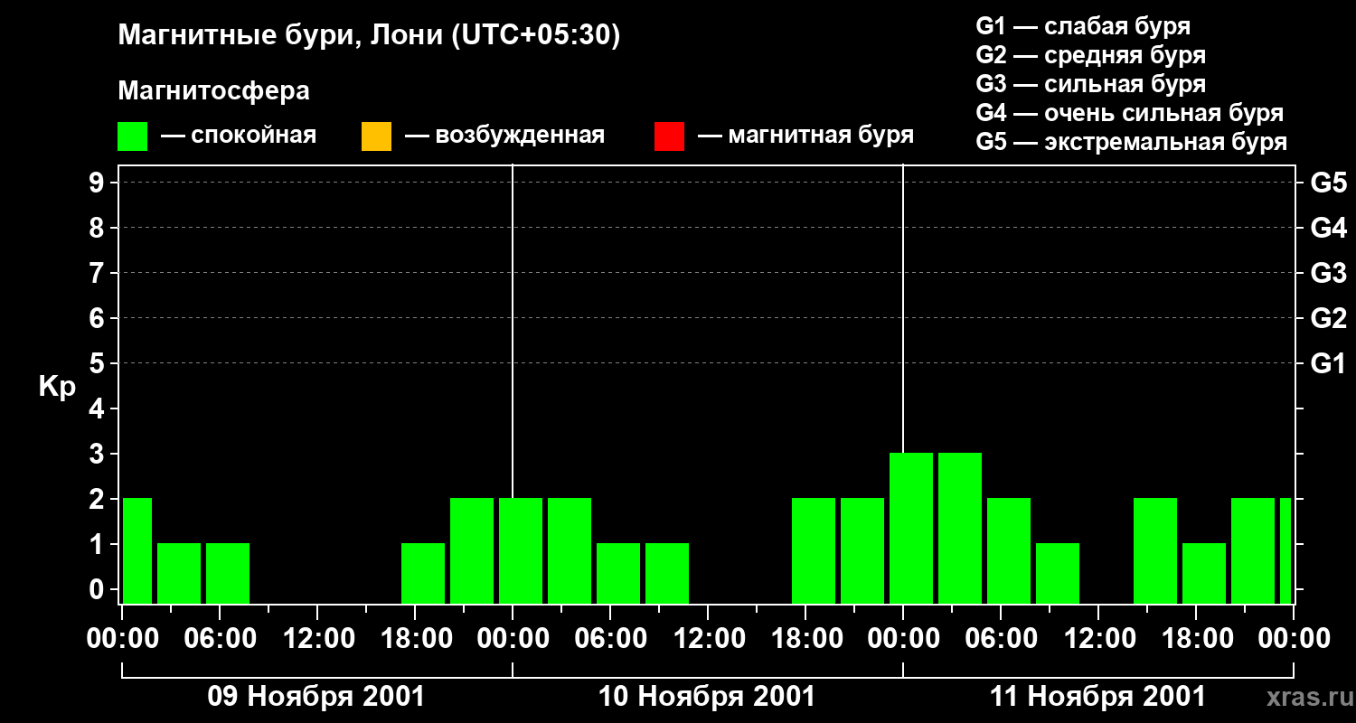 Изменения геомагнитного индекса Kp с 9 по 11 ноября 2001 года для средних широт