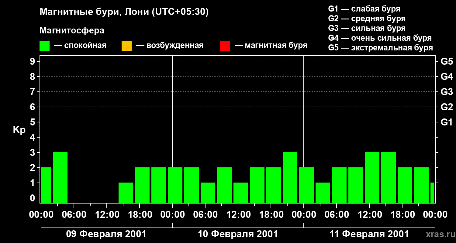 Изменения геомагнитного индекса Kp с 9 по 11 февраля 2001 года для средних широт
