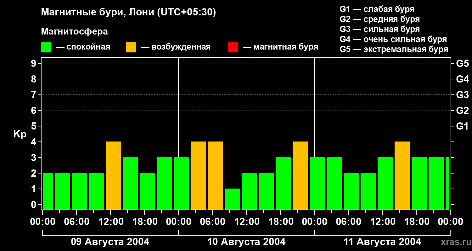 Изменения геомагнитного индекса Kp с 9 по 11 августа 2004 года для средних широт