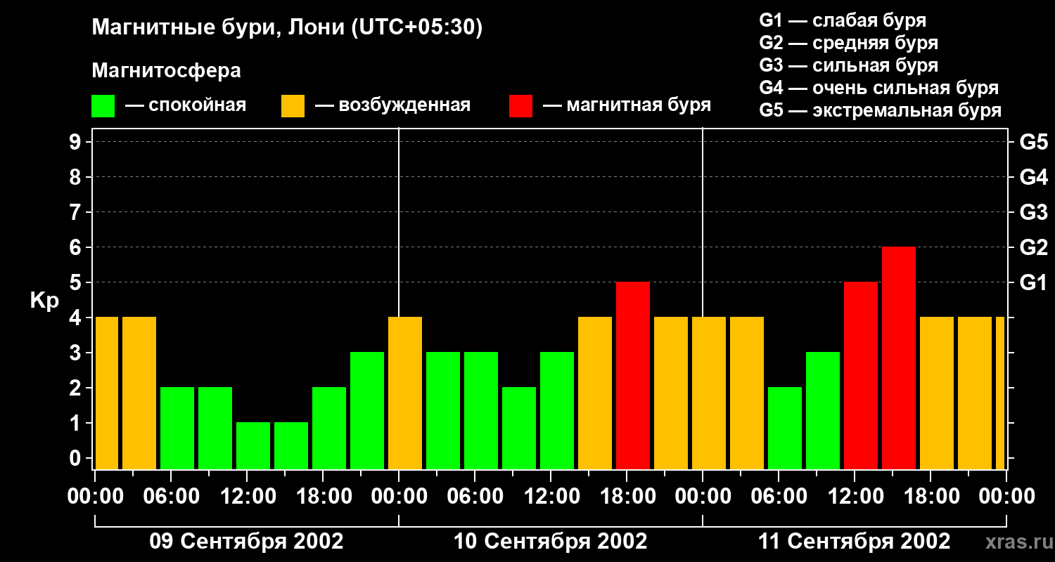 Изменения геомагнитного индекса Kp с 9 по 11 сентября 2002 года для средних широт