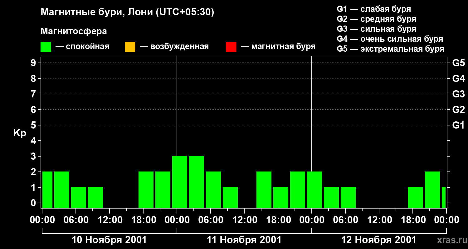 Изменения геомагнитного индекса Kp с 10 по 12 ноября 2001 года для средних широт