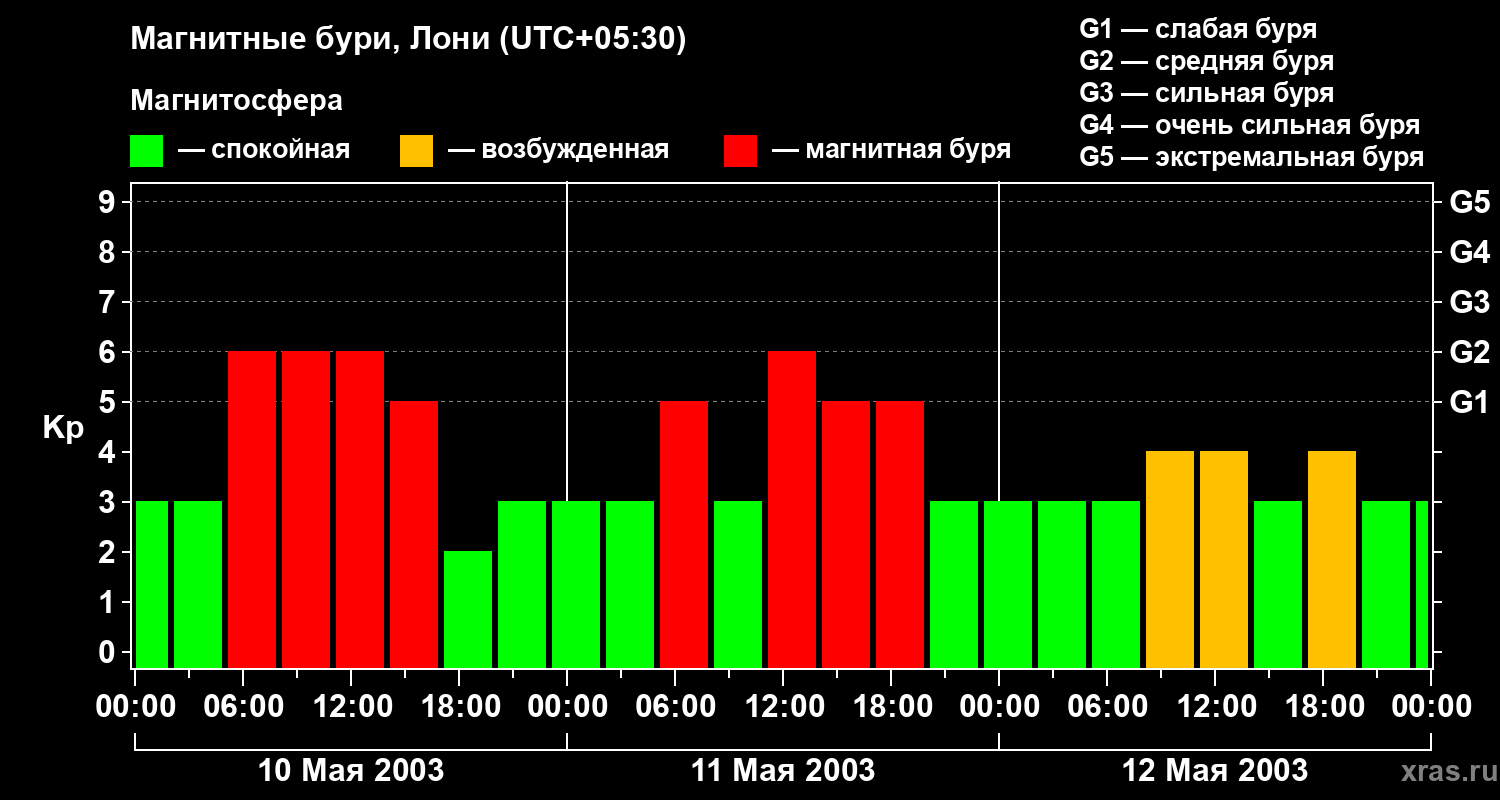 Изменения геомагнитного индекса Kp с 10 по 12 мая 2003 года для средних широт