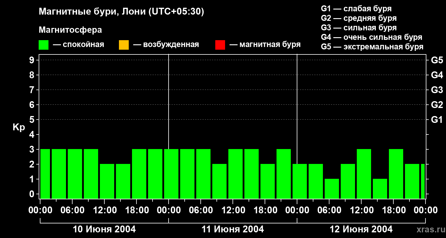 Изменения геомагнитного индекса Kp с 10 по 12 июня 2004 года для средних широт