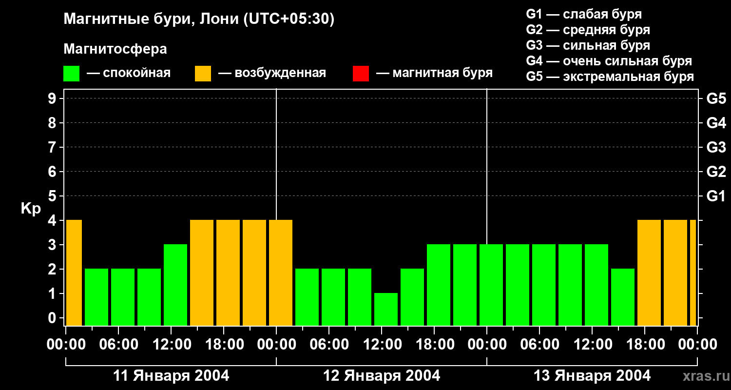 Изменения геомагнитного индекса Kp с 11 по 13 января 2004 года для средних широт