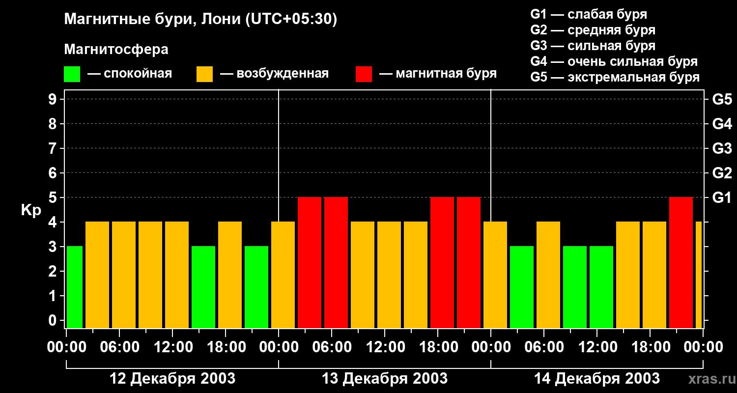 Изменения геомагнитного индекса Kp с 12 по 14 декабря 2003 года для средних широт