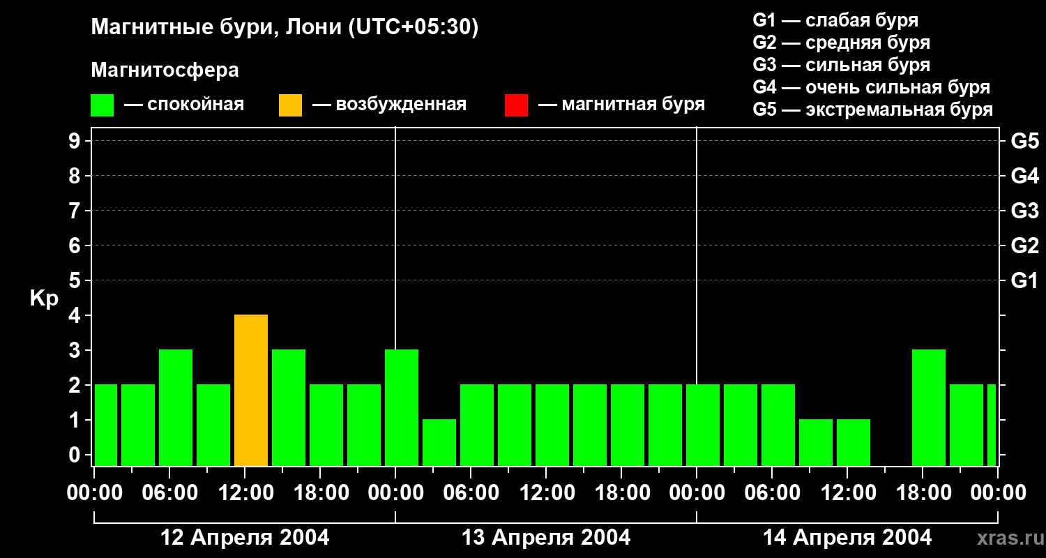 Изменения геомагнитного индекса Kp с 12 по 14 апреля 2004 года для средних широт