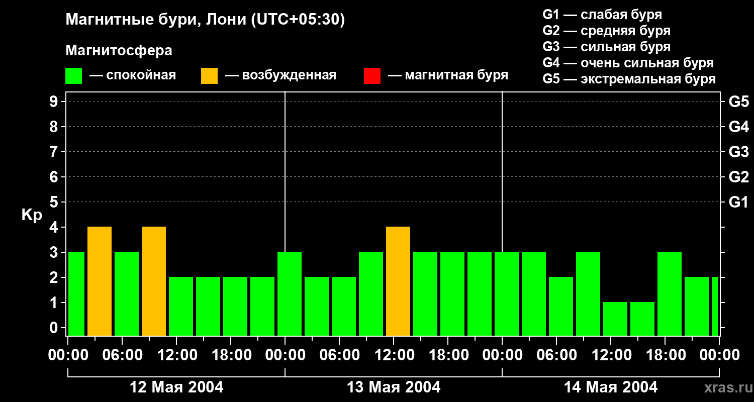 Изменения геомагнитного индекса Kp с 12 по 14 мая 2004 года для средних широт