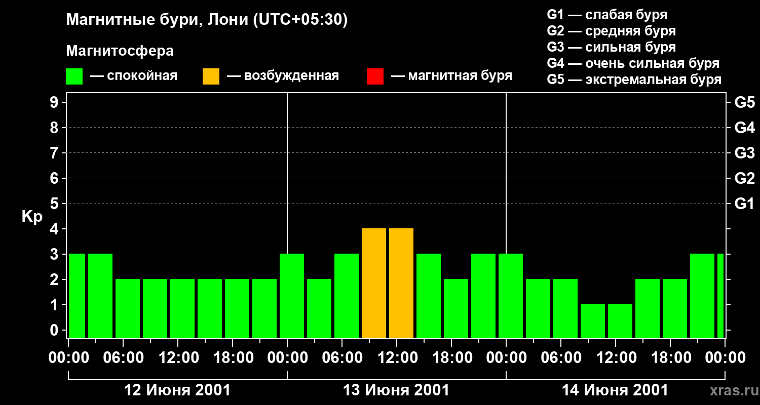Изменения геомагнитного индекса Kp с 12 по 14 июня 2001 года для средних широт